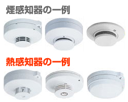 熱感知器 火災発生時の熱に反応するセンサーです。一定温度以上になると反応する定温式スポット、一定の温度上昇率を超えると反応する差動式スポット等があります。